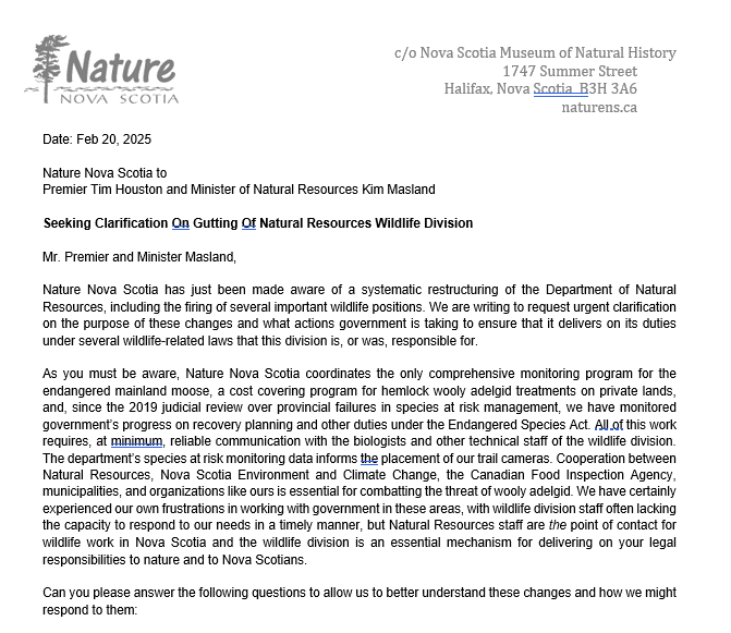 Nature Nova Scotia to Premier Houston & Minister of Natural Resources Kim Masland: Seeking Clarity On Gutting Of Natural Resources Wildlife Division