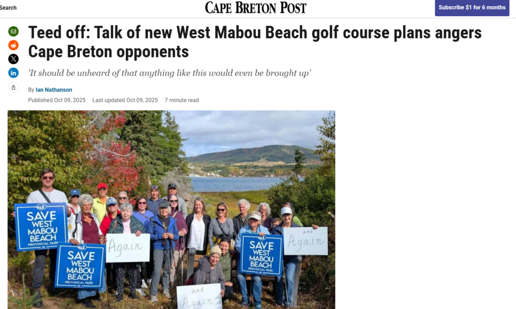 Unfortunately, many protected areas in Nova Scotia are not as protected as the public assumes. By 2020, the last deadline for protecting all of the candidate areas in the 2013 Parks and Protected Areas Plan, there were still hundreds of protected areas pending official designation. Many of these areas are still not protected today. Owl’s Head Provincial Park, long assumed to be officially protected, was secretly delisted from the Parks and Protected Areas Plan in 2019 and nearly sold off to a private developer before action from local citizens saved the area. In 2022, the province entertained yet another proposal from the Cabot Group to build a golf course at West Mabou Beach Provincial Park, and citizens again had to come to the rescue. Almost unbelievably, in 2025, the province again entertained the possibility of leasing West Mabou Beach to the Cabot Group, hiding the corporations’ formal application for the park from citizens while the Minister of Natural Resources, Kim Masland, insisted government was “just having conversations” with the developer. The province only announced that it would not further discussions with Cabot under much public pressure.